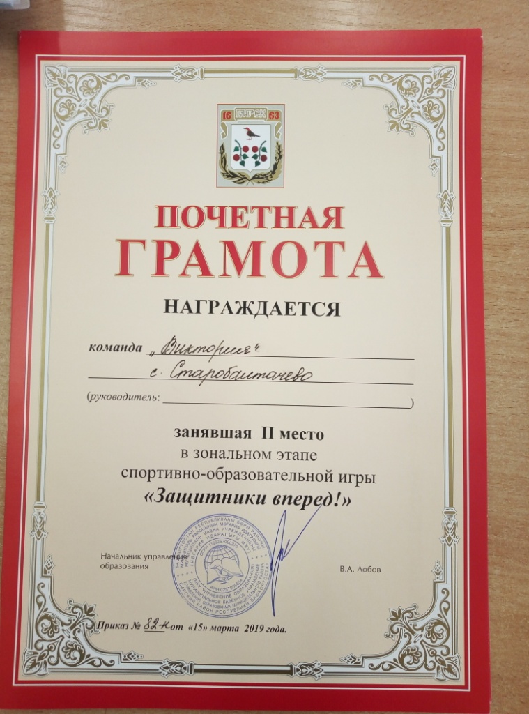 15.03.2019 года состоялся зональный этап Всероссийской спортивно-образовательной игры "Защитники, вперед!"в г.Бирске. Среди 8 команд северо-западных районов республики команда нашей школы заняла 2 место. Поздравляем!!!