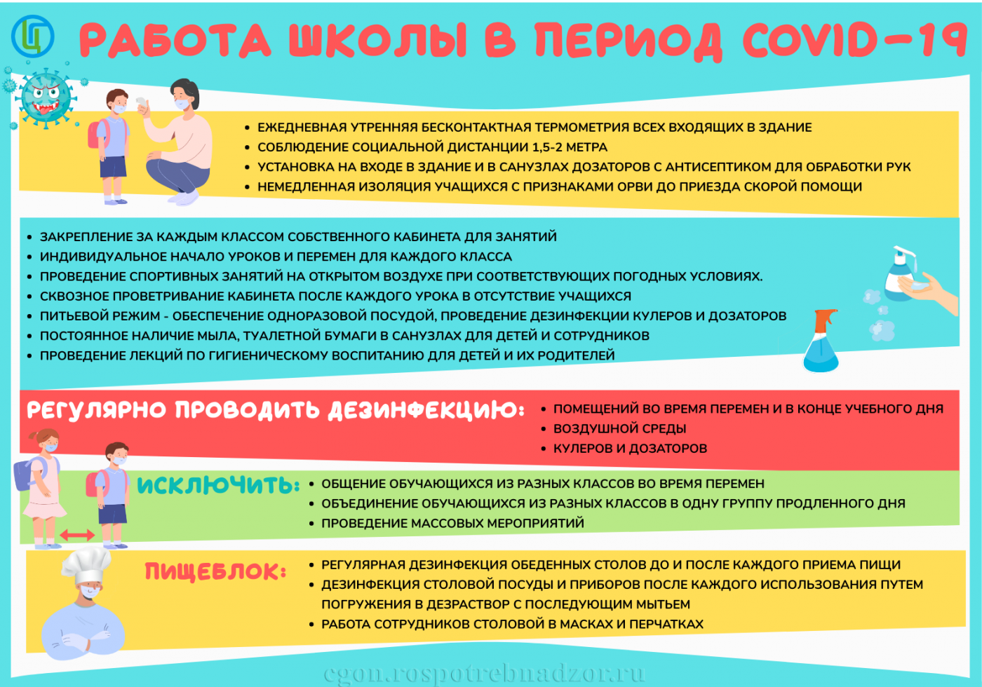 Для обучающихся 1-5 и 11 классов, а также для обучающихся малокомплектных общеобразовательных организаций (1-11 классы) образовательный процесс организуется в очной форме с возобновлением работы пищеблоков при соблюдении санитарно-эпидемиологических правил, а также требований и рекомендаций Роспотребнадзора.